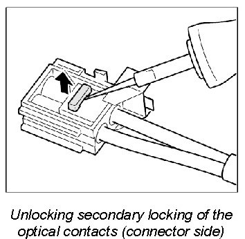 3. Position the press-out and unlocking tools for flat-type and round plug connectors of all sizes NR.155 for releasing the contact locking mechanism of the optical waveguide module and lift up the locking mechanism.