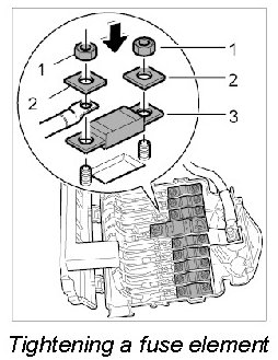 9. Unscrew the fastening nuts -1-, remove the washer -2- and take out the fuse element -3-.