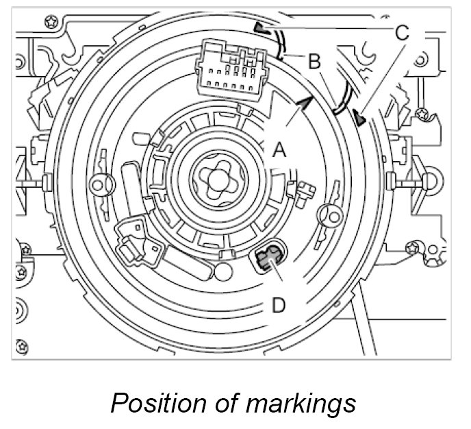 - Ensure that the arrow -A- of the rotor is positioned between the markings -B- of the arrows -C- of the airbag contact unit and that the latch -D- is engaged.