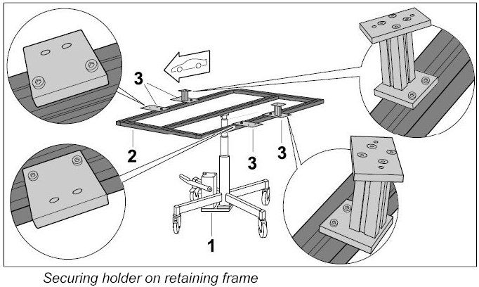 1.2. Secure holder -3- on the retaining frame -2- at the positions shown using fastening screws and inlay nuts.