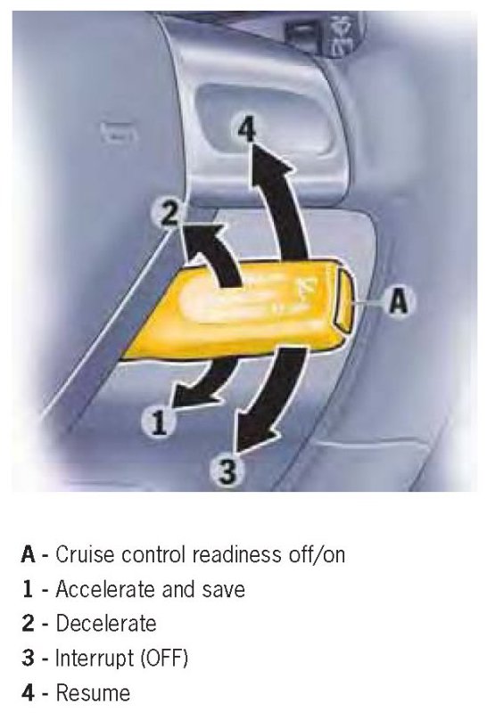 The speed can be changed in constant steps via the steering column stalk while cruise control is active: