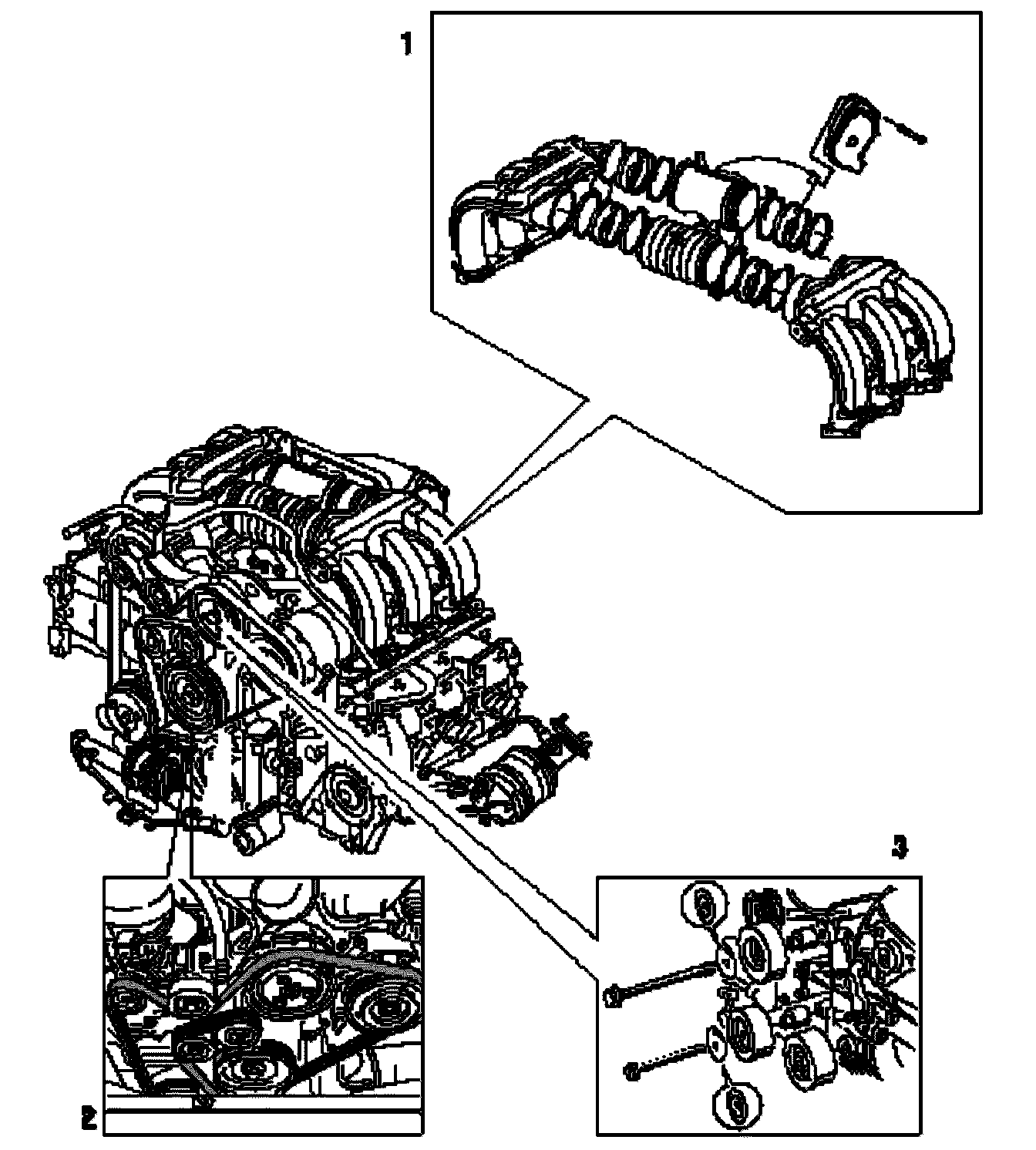 17. Remove power-steering pump with the lines by unscrewing the three Torx screws (M8 x 30) -3- and the Torx screw (M8 x 12) -2-.