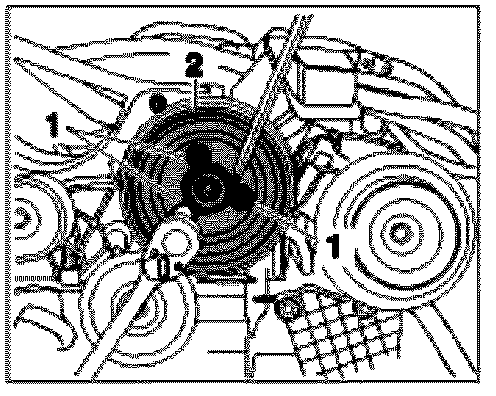3. Remove pulley -2- of power-steering pump; to do this, counter the pulley -2- as shown using a screwdriver, then loosen and remove the three Torx screws (M8 x 12) -1 -.