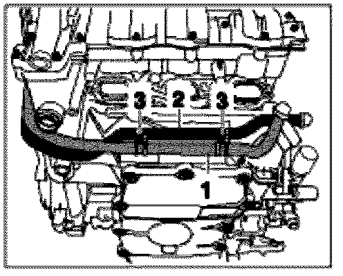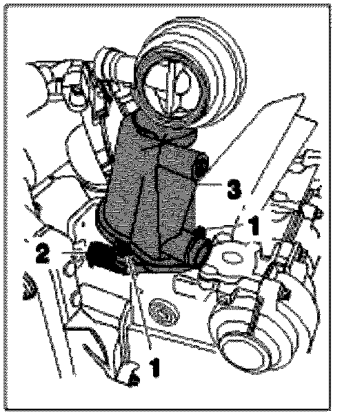 8. Loosen support for servo lines -2- by unclipping the oxygen sensor from the support -3- and unscrewing the two Torx screws (M6 x 12) -1 -. Replace screws during installation.