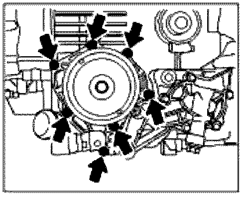 Remove water pump by unscrewing the six hexagon-head bolts (M6 x 25, M6 x 30) -arrows-. Replace metal seal during installation.