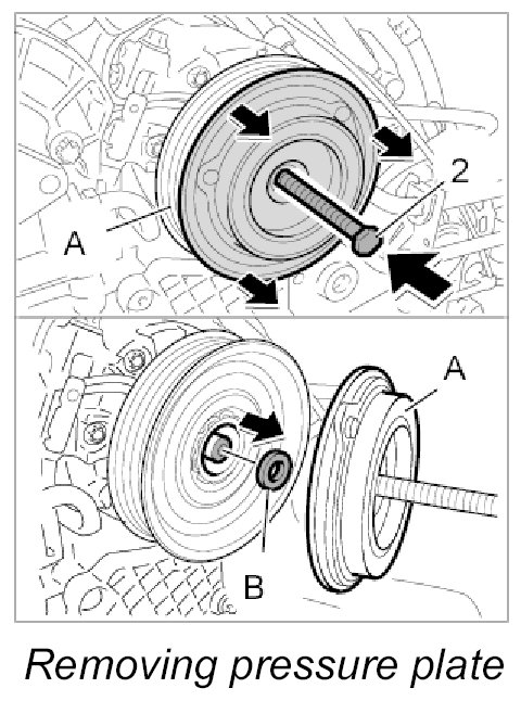 3. Take off spacers -B- behind the pressure plate.