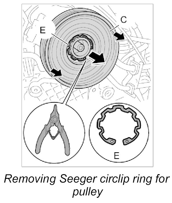 4. Use a Seeger circlip ring pliers to remove the Seeger circlip ring -E-on the pulley -C-.
