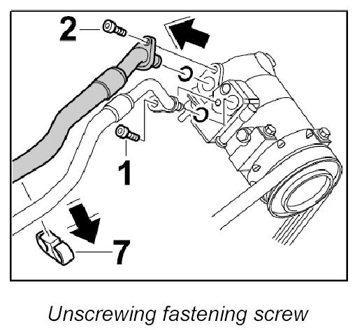 3. Unscrew the refrigerant line between the compressor and condenser at the connection points on the compressor and on the condenser and disconnect it.