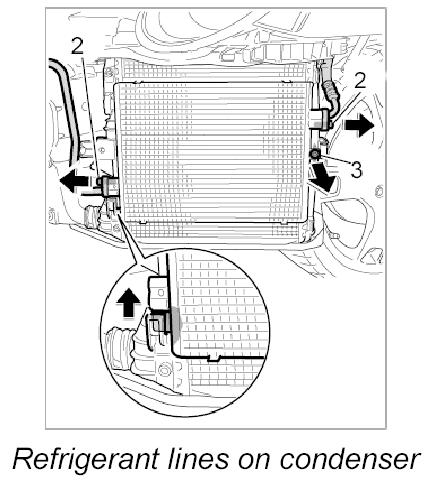 INFORMATION: When loosening or tightening the M8 refrigerant lines on the condenser, always counter with a 21-mm open-ended wrench.