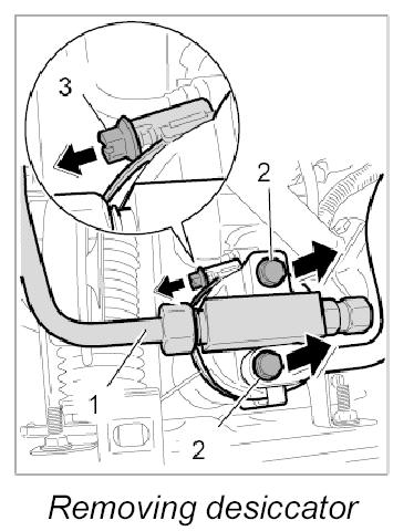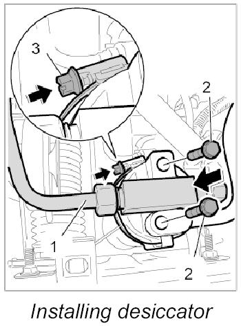 The desiccator (fluid tank) is located under the left plenum chamber cover.