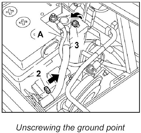 2. Unscrew the fastening nut -2- for the ground point on the body and disconnect the negative terminal -3- at the battery.