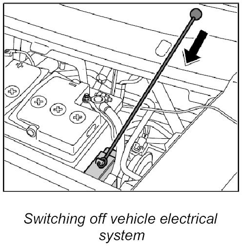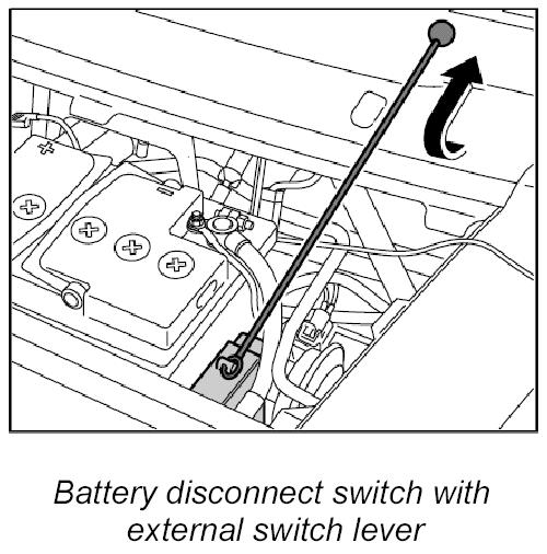 The battery disconnect switch, which is supplied via the positive terminal, is closed manually using the external switch lever and locked electromagnetically. The luggage compartment lid must not be open when doing this.