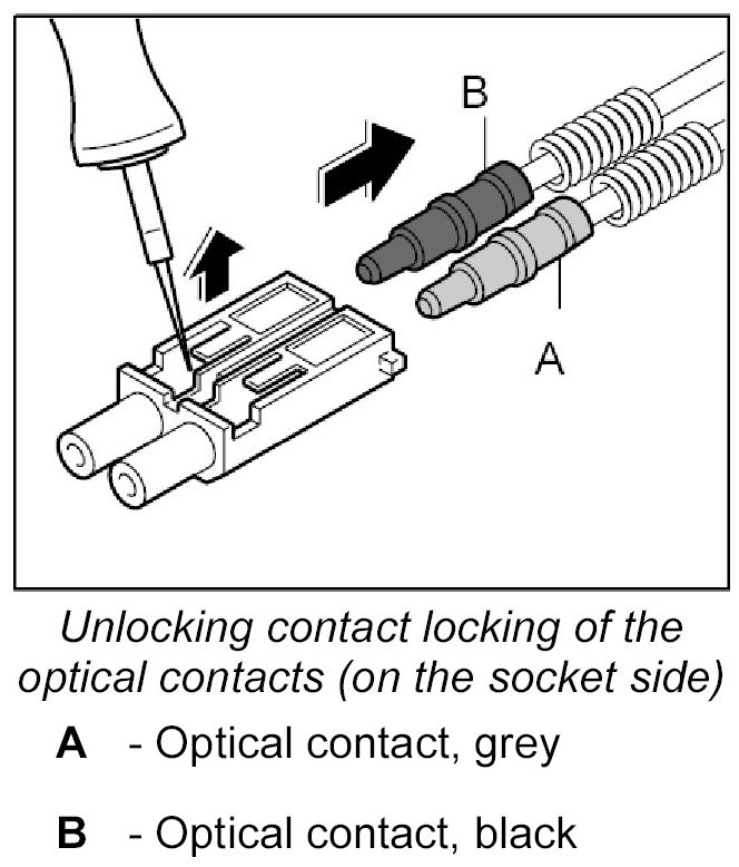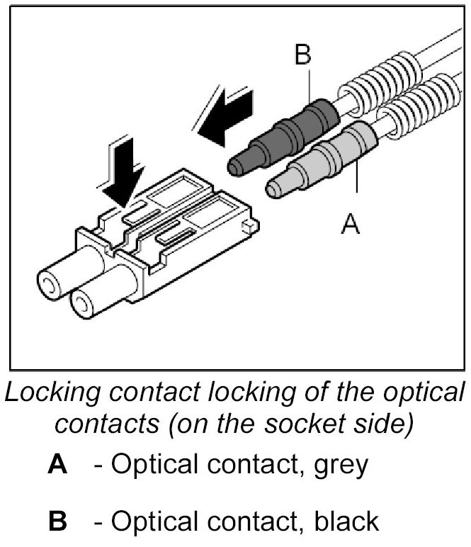 The LWL is delivered with affixed plastic contacts. These contacts are latched in the connector housing in the case of repairs. Grey and black contacts with identical mechanical dimensions are used.