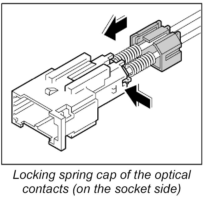 The LWL and the plug connections must not come into contact with fluids such as water, creeping compound, preservative, anti-freeze protection, cleaning agent. They will impair the MOST system function or cause complete system failure. Even plug connectors with plugged-in protective caps must not come into contact with the fluids listed.