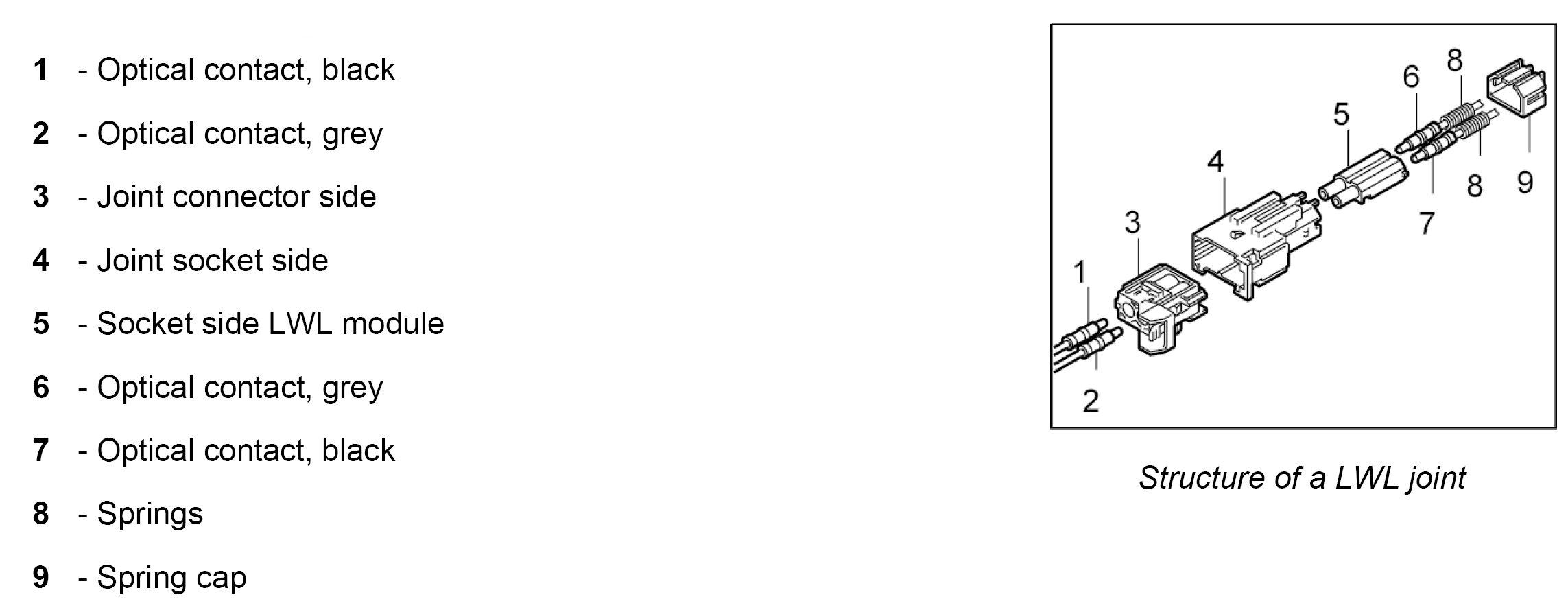 The LWL is delivered with affixed plastic contacts. These contacts are latched in the connector housing in the case of repairs. Grey and black contacts with identical mechanical dimensions are used.