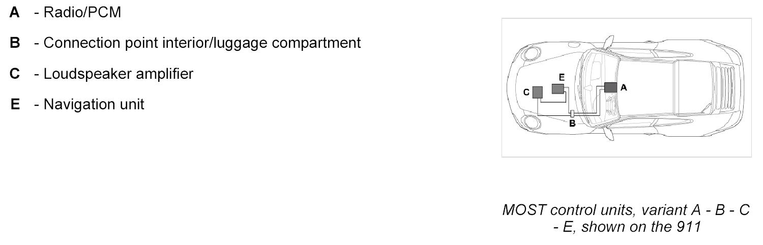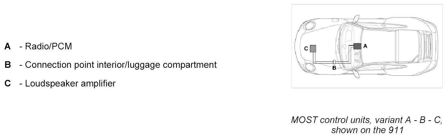 INFORMATION: Depending on the equipment I No., the installation positions of the audio components in the front luggage compartment differ.