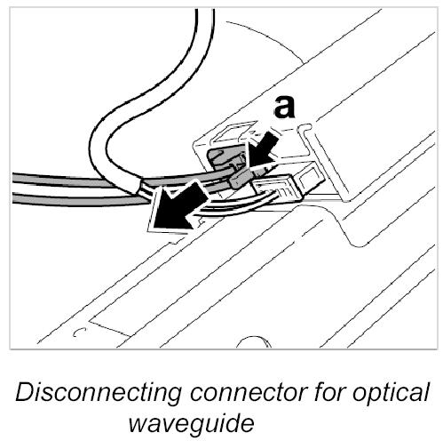 4. Carefully pull on the optical waveguide -A and B- in -direction of arrow-. If it is not possible to pull out the optical waveguide, check again if the locking mechanism is completely released.