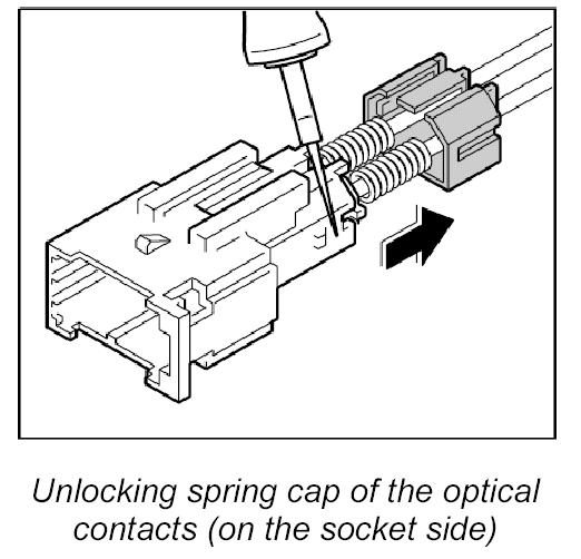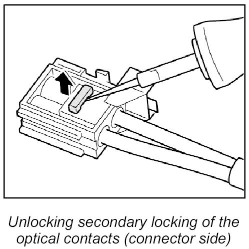 3. Position the press-out and unlocking tools for flat-type and round plug connectors of all sizes NR.155 for releasing the contact locking mechanism of the optical waveguide module and lift up the locking mechanism.