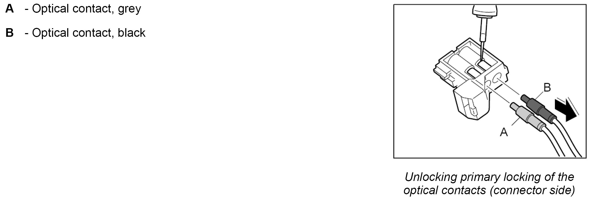 3. Carefully pull on the optical waveguide -A and B- in -direction of arrow-. If it is not possible to pull out the optical waveguide, check again if the secondary locking mechanism is completely released and if the primary locking mechanism is raised sufficiently.