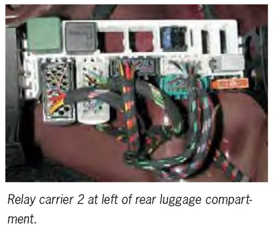 Fuse carrier in left footwell, relay carrier (slot 6) at left of rear luggage compartment and in current distributor.