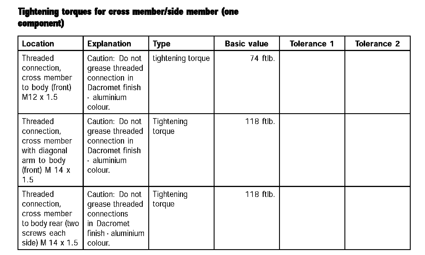 Tightening torques for cross member/side member (one component):