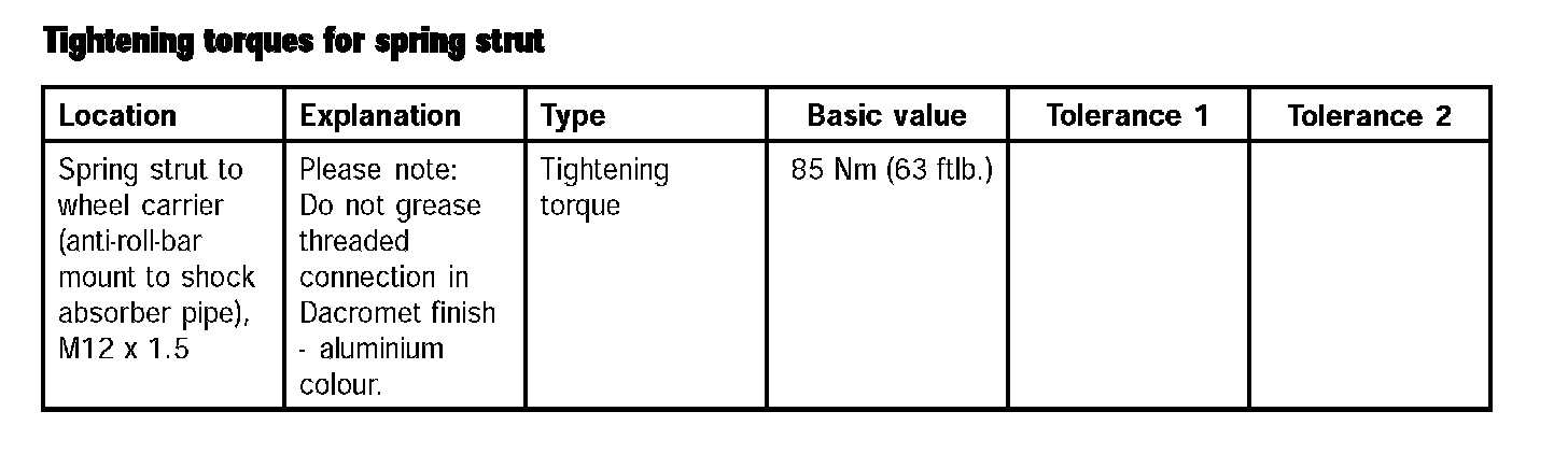 Tightening torques for spring strut