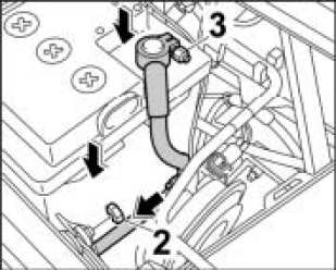 5. Position lead for the negative terminal on the battery again and screw it firmly into place -3-. Tightening torque 3.5 ftlb.