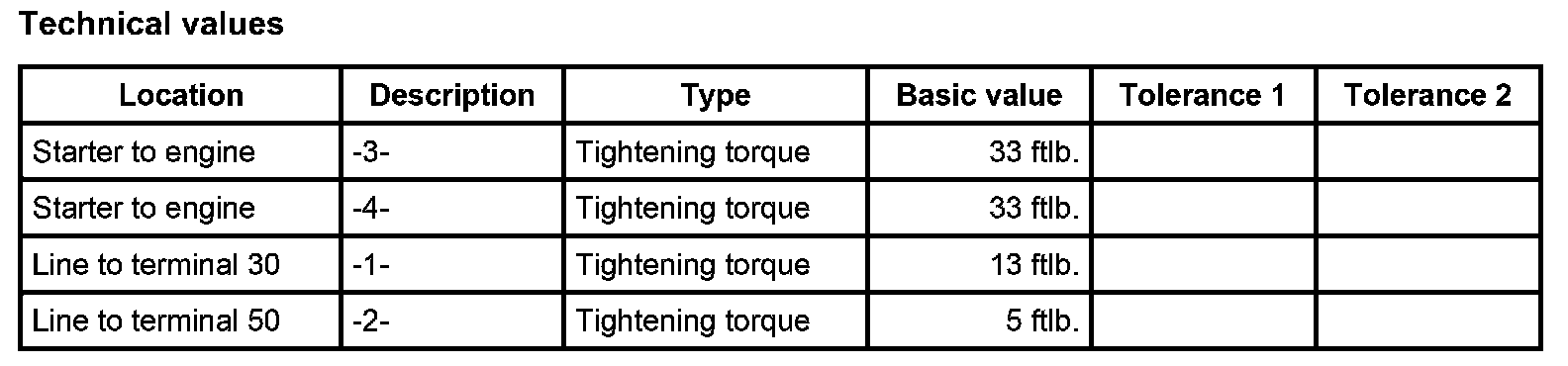 3. Position electrical leads on the starter and tighten with fastening nuts -1, 2- . - Tightening torque: 13 ftlb. - Tightening torque: 5 ftlb.