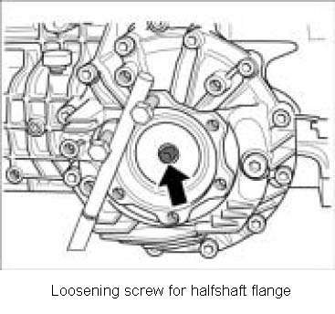 2. Unscrew fastening screw for halfshaft flange. To do this, screw two drive shaft screws into the halfshaft flange for countering purposes and loosen fastening screw.