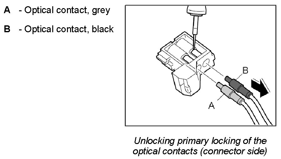 3. Carefully pull on the optical waveguide -A and B- in -direction of arrow-. If it is not possible to pull out the optical waveguide, check again if the secondary locking mechanism is completely released and if the primary locking mechanism is raised sufficiently.
