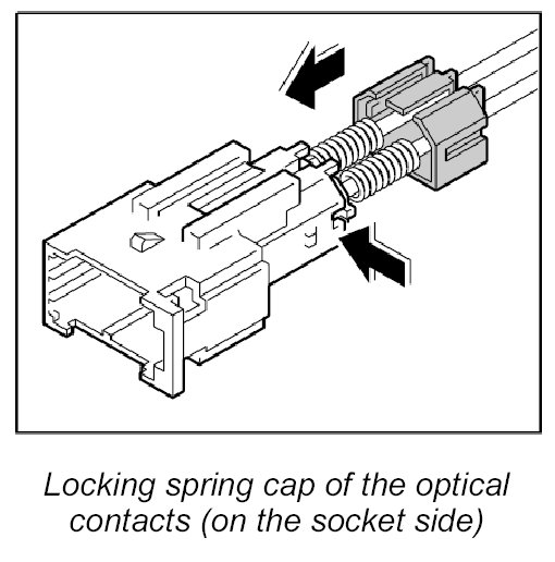 At a force of 10 N (7.5 lb.) the springs installed in the connection point will be compressed. This leads to an increase in attenuation, which could lead to system impairment and system failure. Therefore a maximum force of 10 N (7.5 lb.) may be used to pull on optical waveguides at connection points.