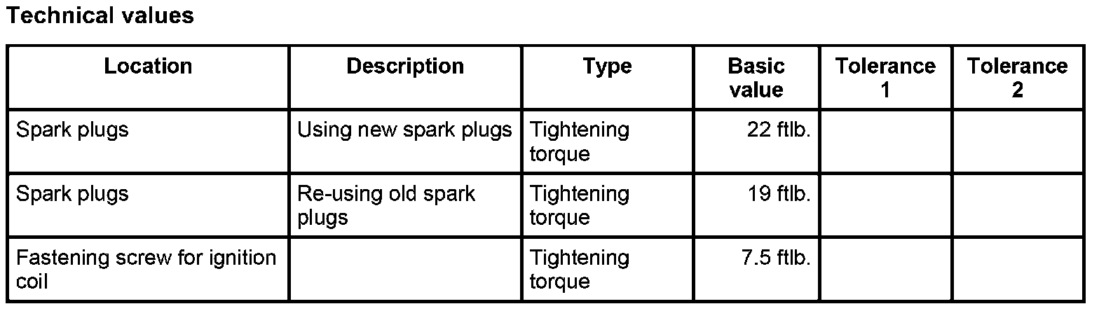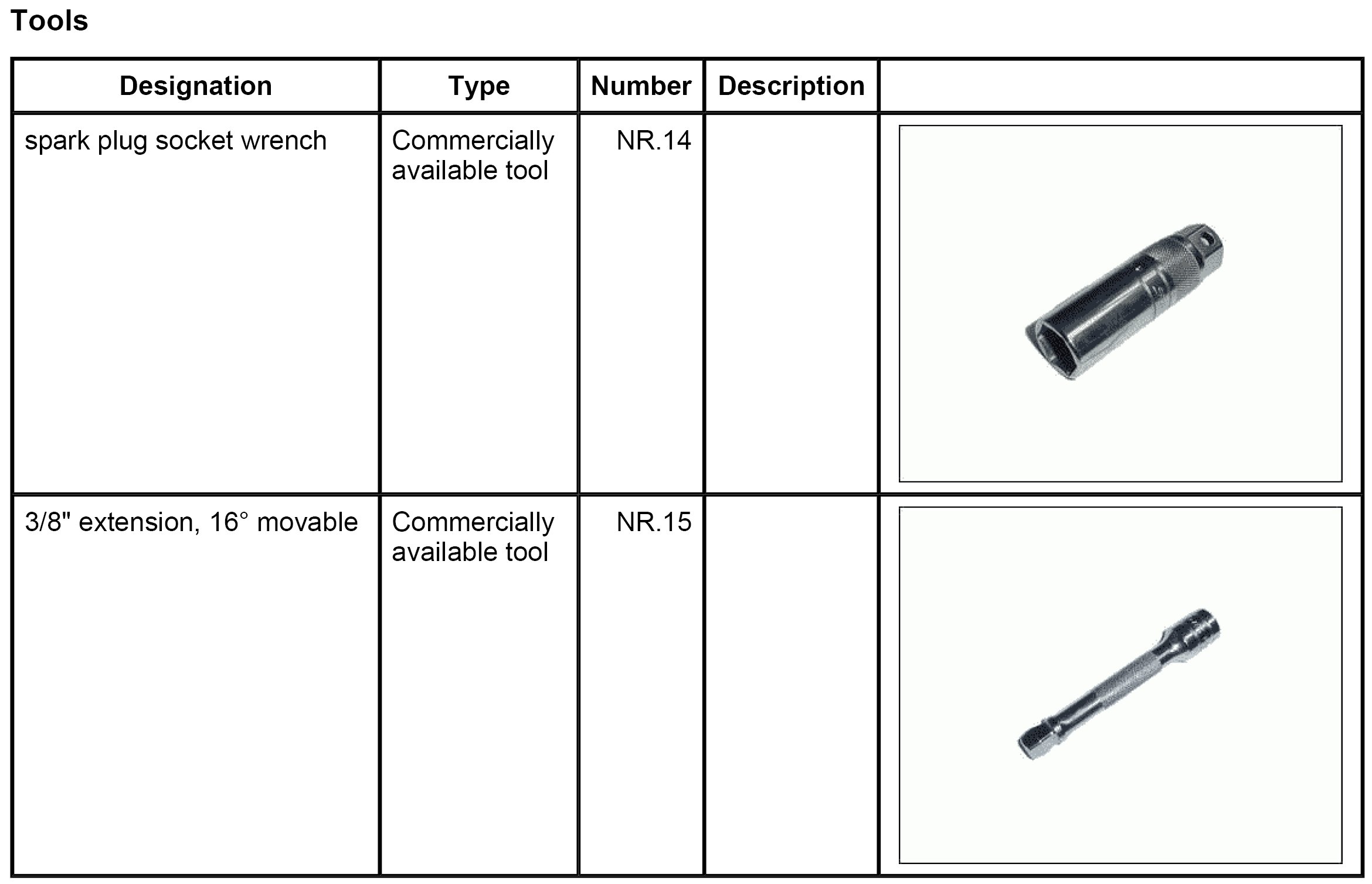 1. Install spark plugs using spark plug socket wrench NR.14 and 3/8" extension, 16 degrees moveable NR.15. The tightening torque is reduced if the spark plugs are removed and installed again for another activity. Do not get spark plugs mixed up during reinstallation.