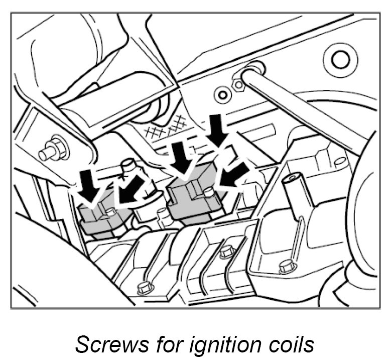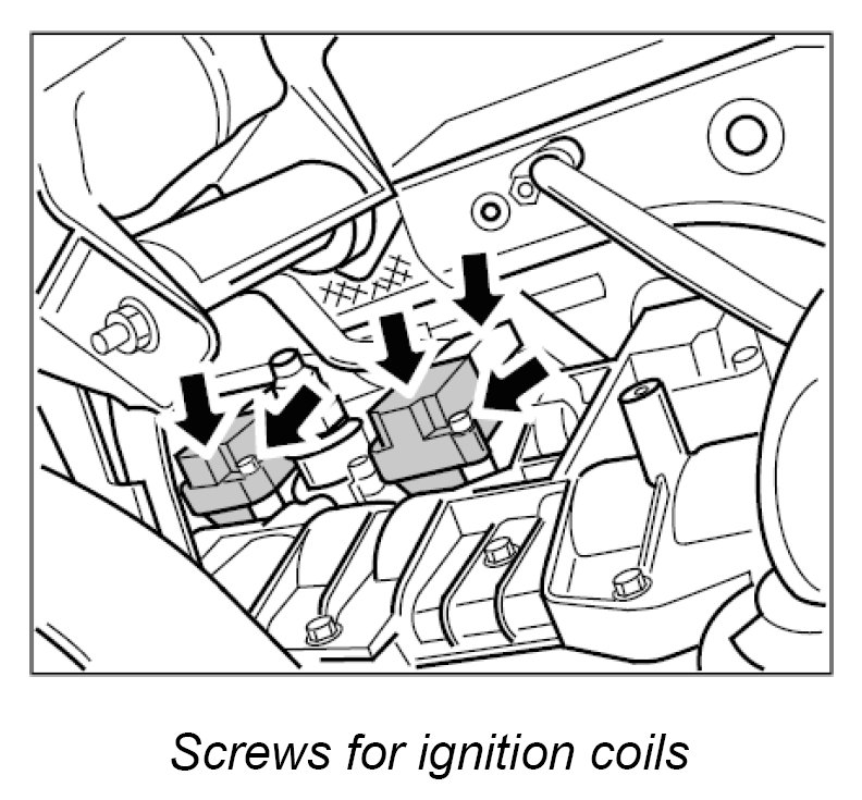 3. Unscrew two M6 x 25 fastening screws -arrow- each per ignition coil and remove the six ignition coils individually.