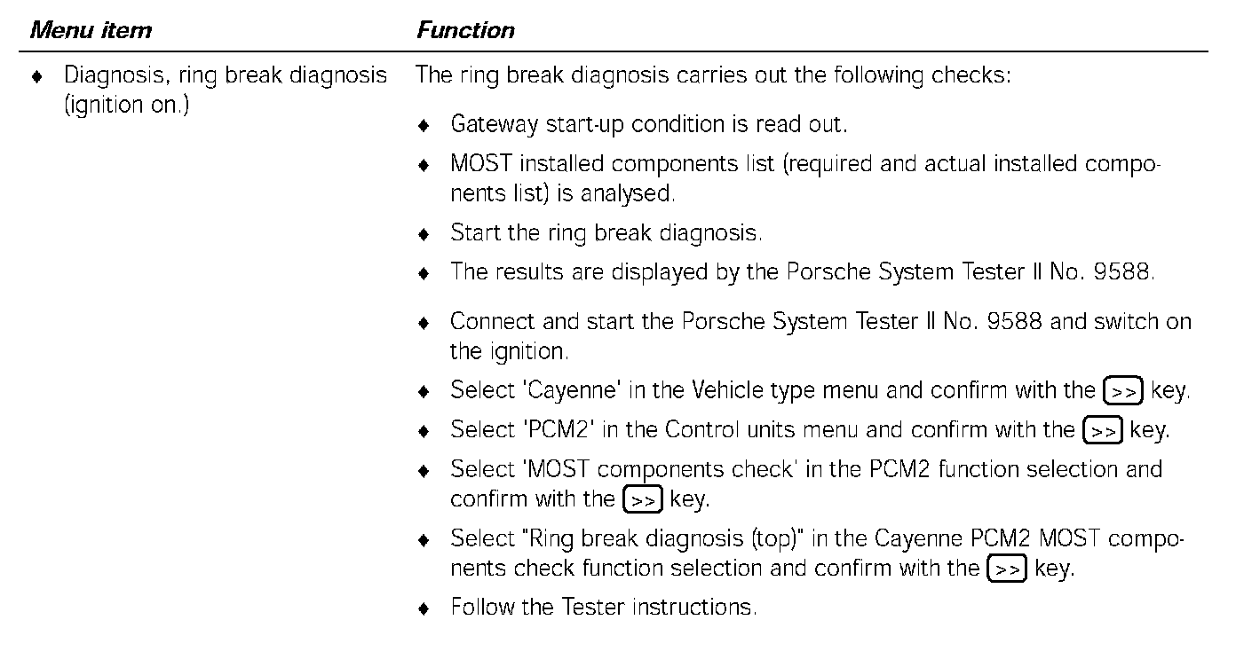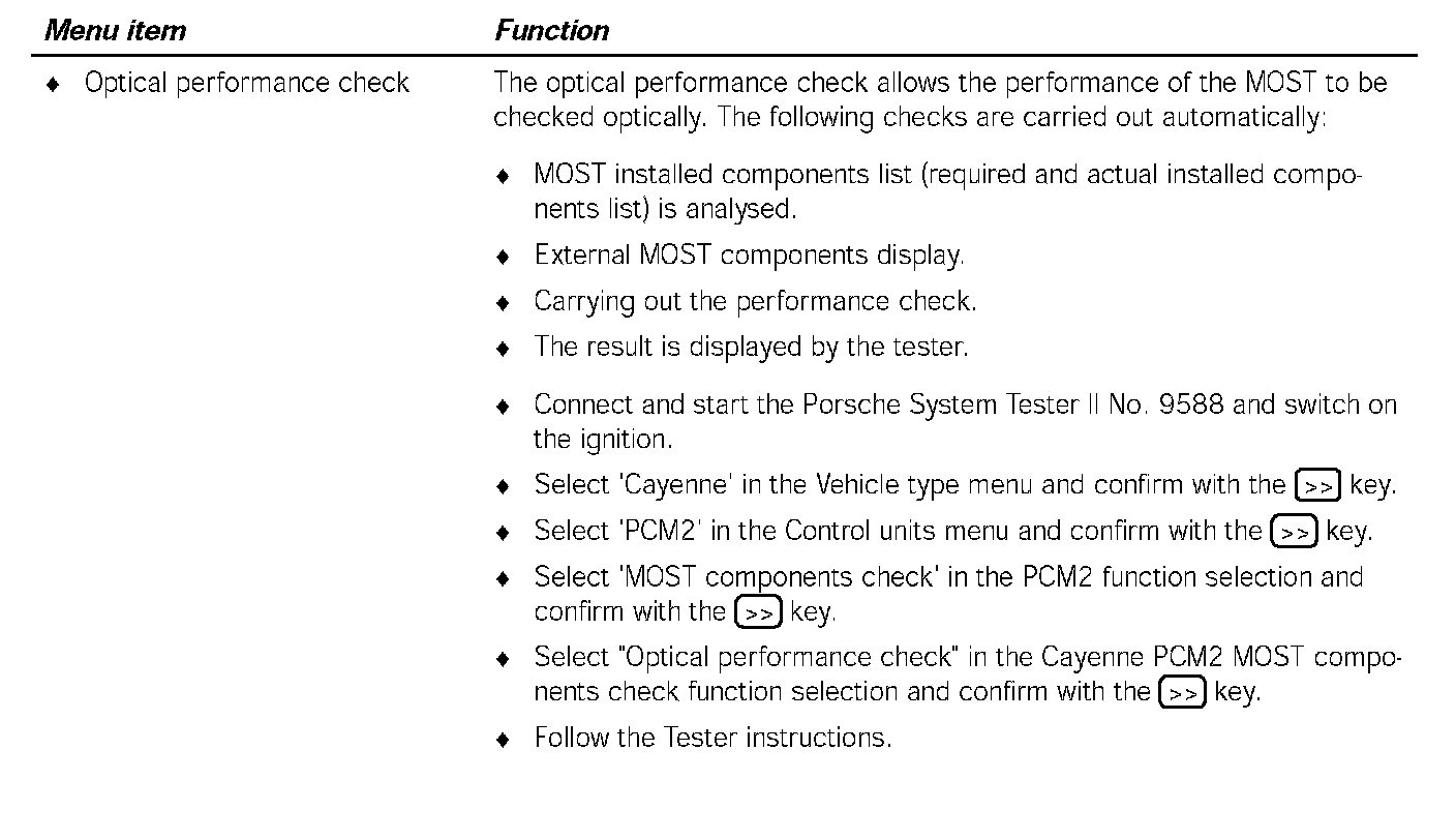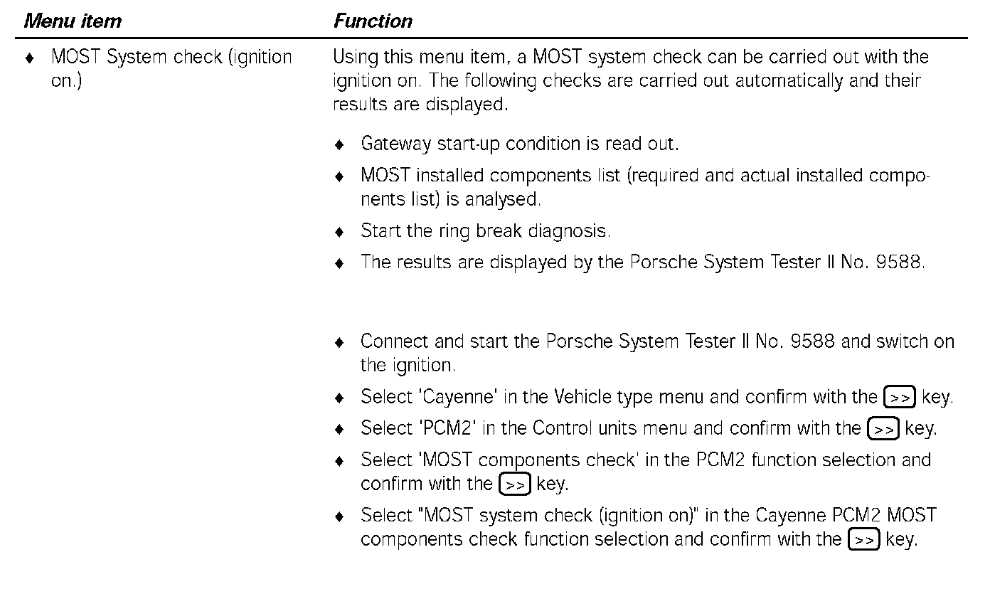 Communication between the Porsche System Tester II No.9588 and the MOST control units only takes place via the K lead to the instrument cluster. The data is transferred from the instrument cluster gateway to the MOST control units, via CAN Comfort to the PCM2 gateway, via the electrical MOST in the PCM2 and via the optical MOST outside of the PCM2.