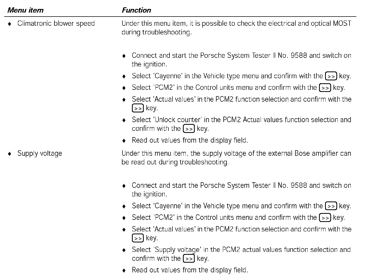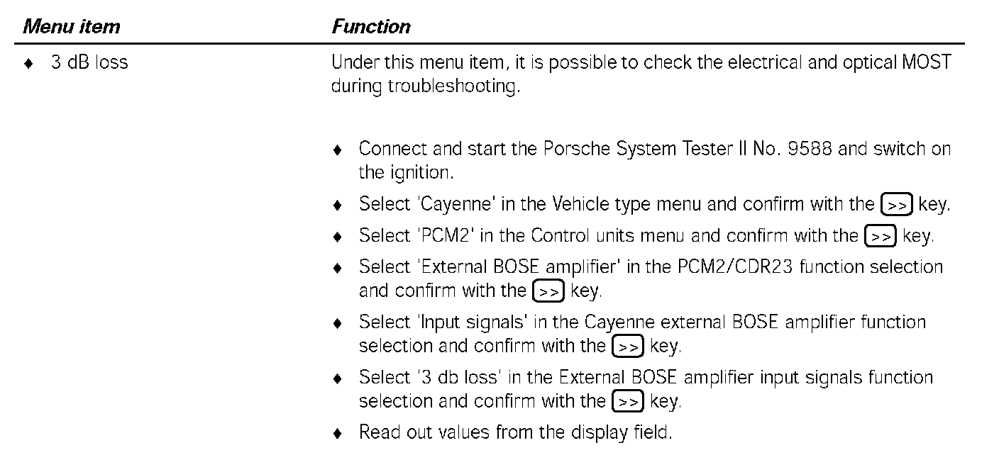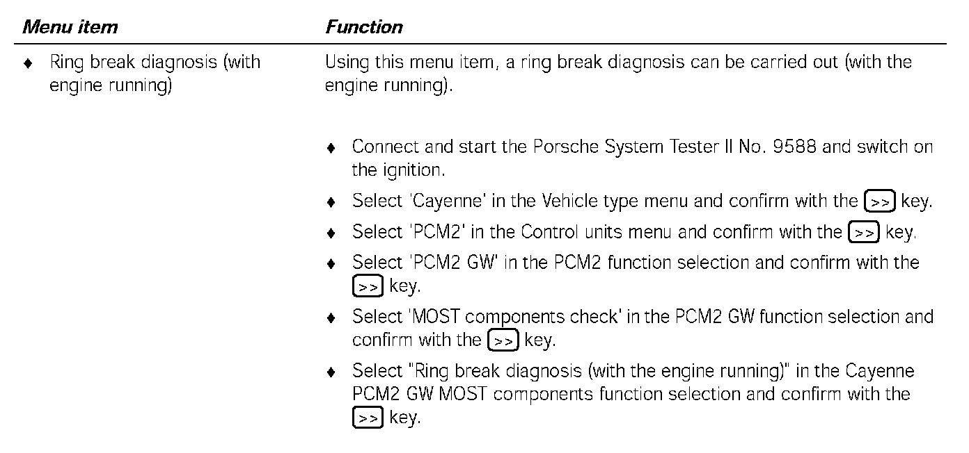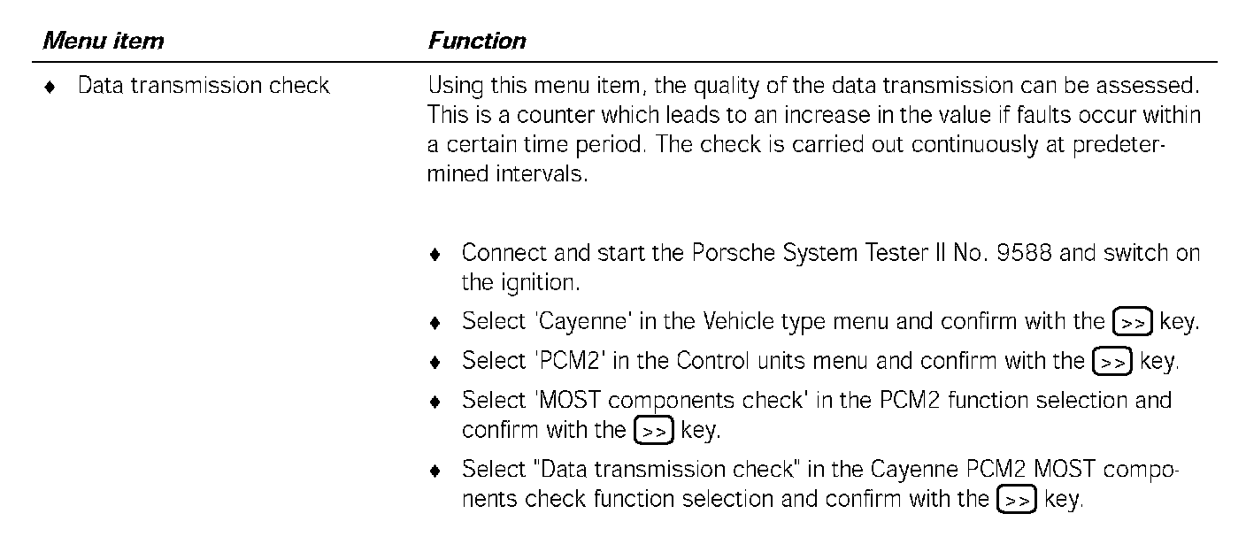 Communication between the Porsche System Tester II No.9588 and the MOST control units only takes place via the K lead to the instrument cluster. The data is transferred from the instrument cluster gateway to the MOST control units, via CAN Comfort to the PCM2 gateway, via the electrical MOST in the PCM2 and via the optical MOST outside of the PCM2.