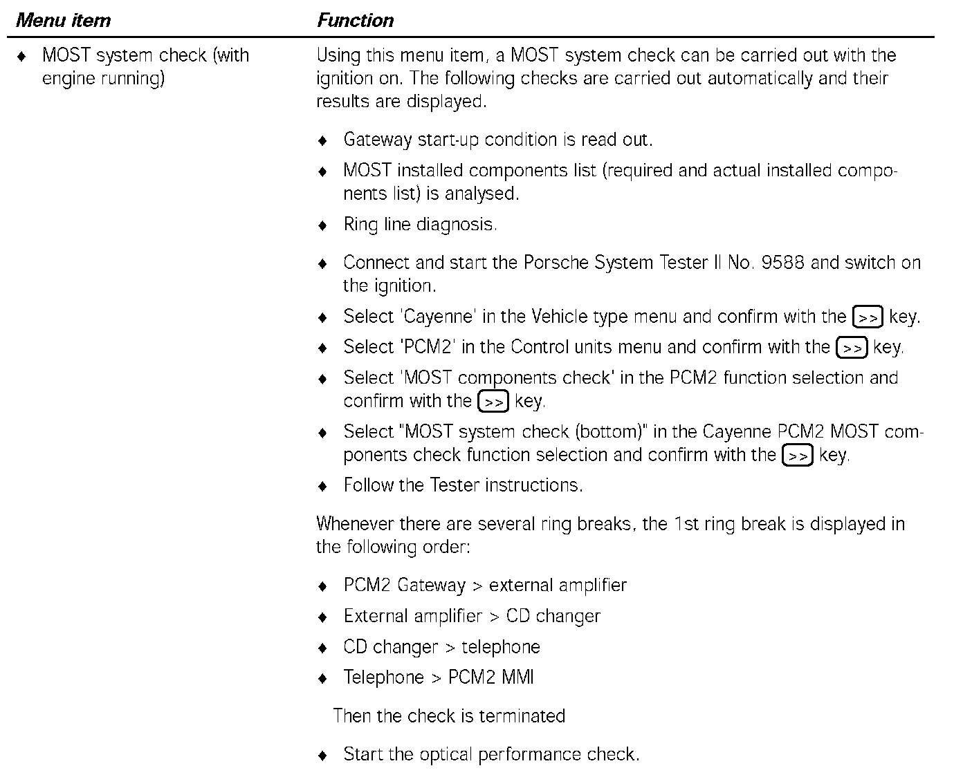NOTE: When there is a customer complaint or identifiable problems but no fault code entries, firstly the 'MOST component check' is to be selected in the PCM2 function selection menu and then the 'MOST system check' is to be carried out.