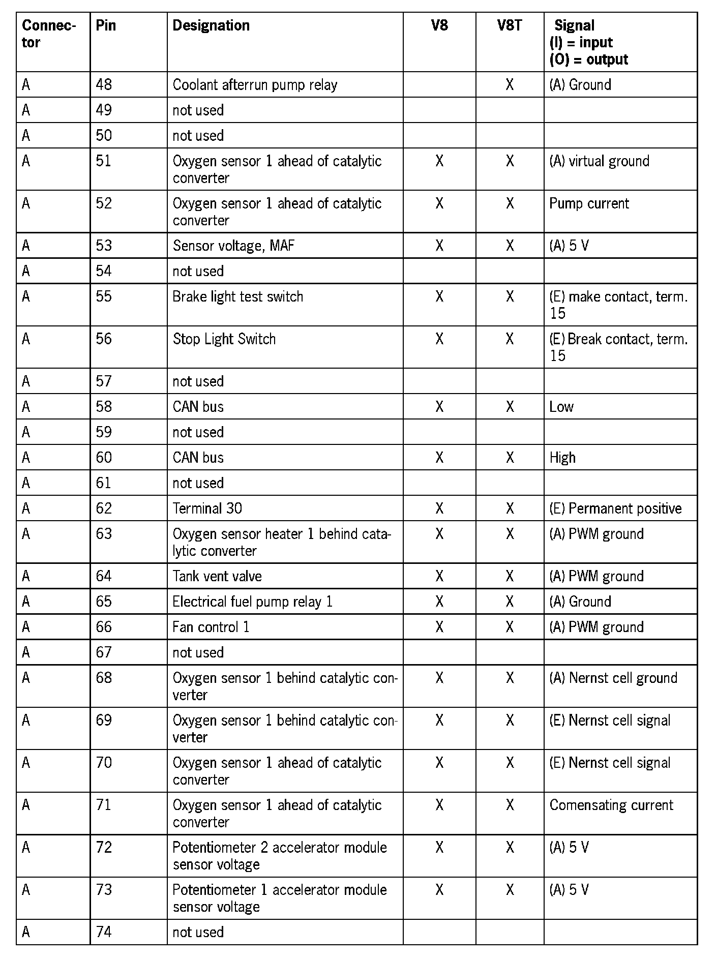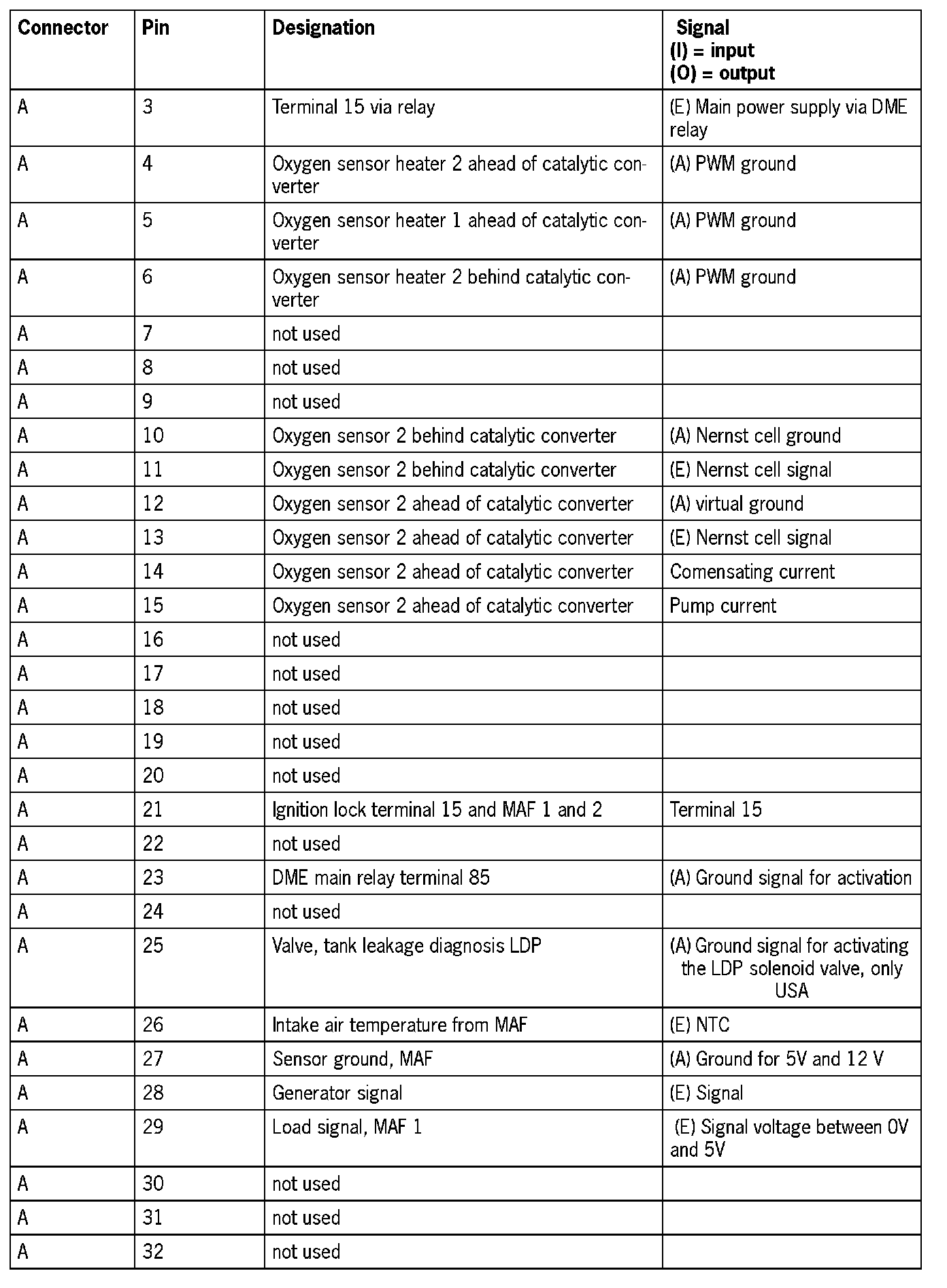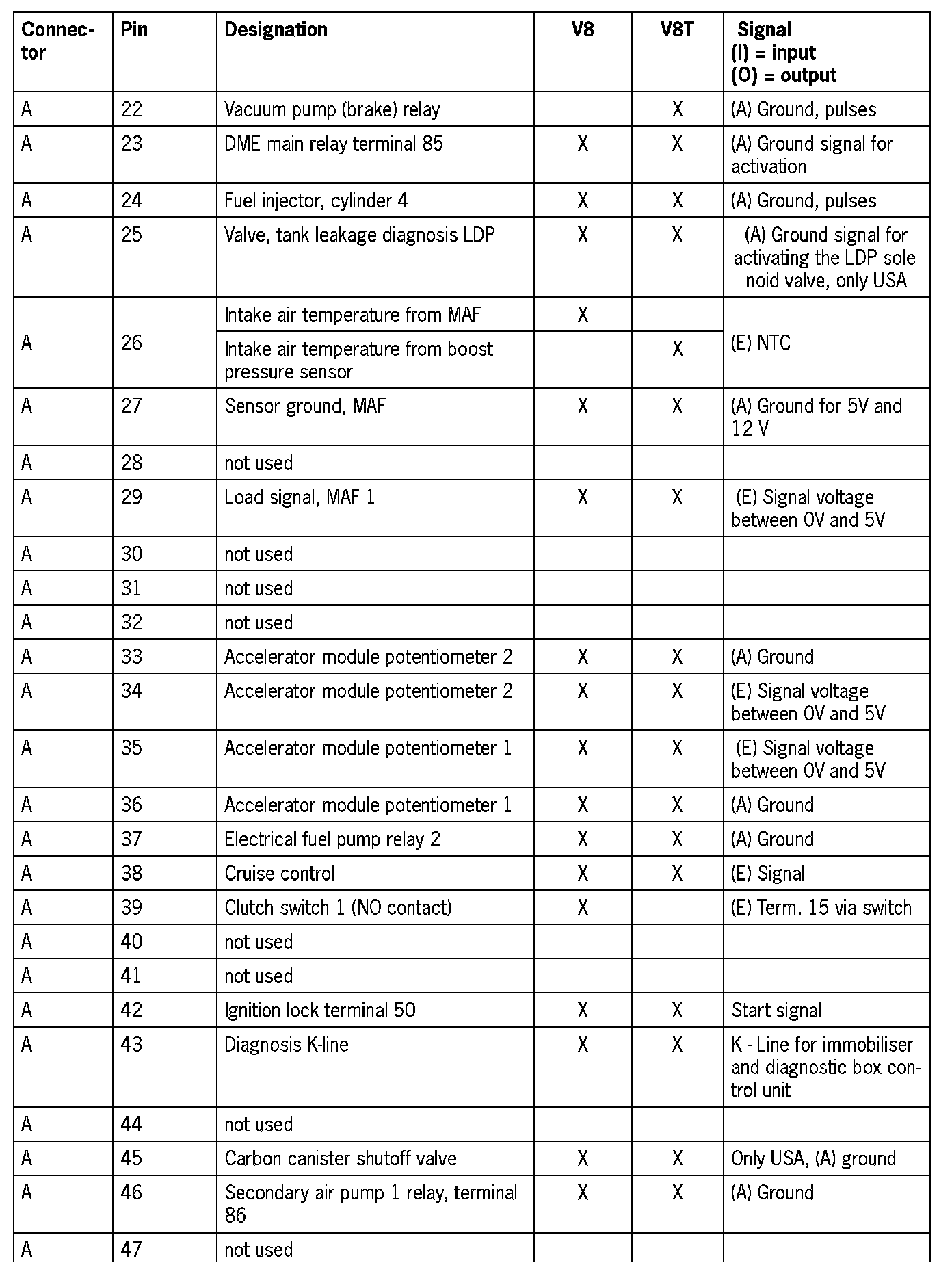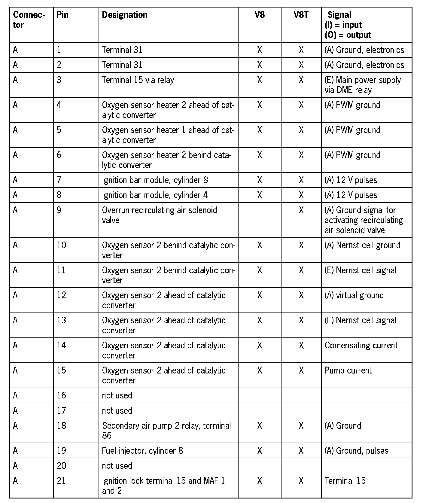 Connector pin assignment of DME 7.1.1Control module and connectors