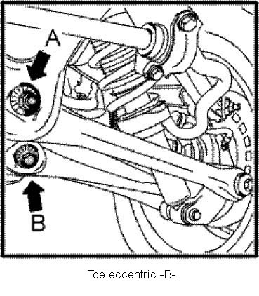 Specified tightening torque for fastening nut to toe eccentric -B- = 180 Nm (133 ft lb.)!