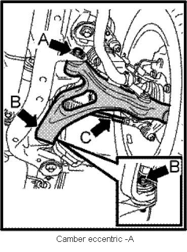 Specified tightening torque for fastening nut to camber eccentric -A- = 133 ft lb.