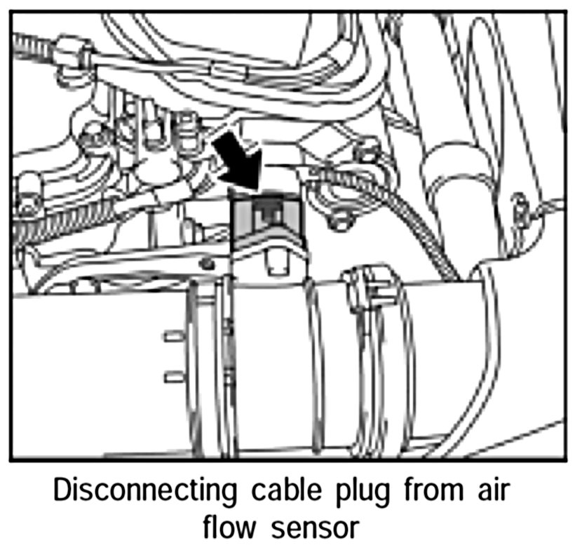1. Remove connecting tube from the air cleaner to the engine. To do so, loosen the hose clamp on the throttle adjuster and pull off the pipe. Disconnect cable plug from air flow sensor.