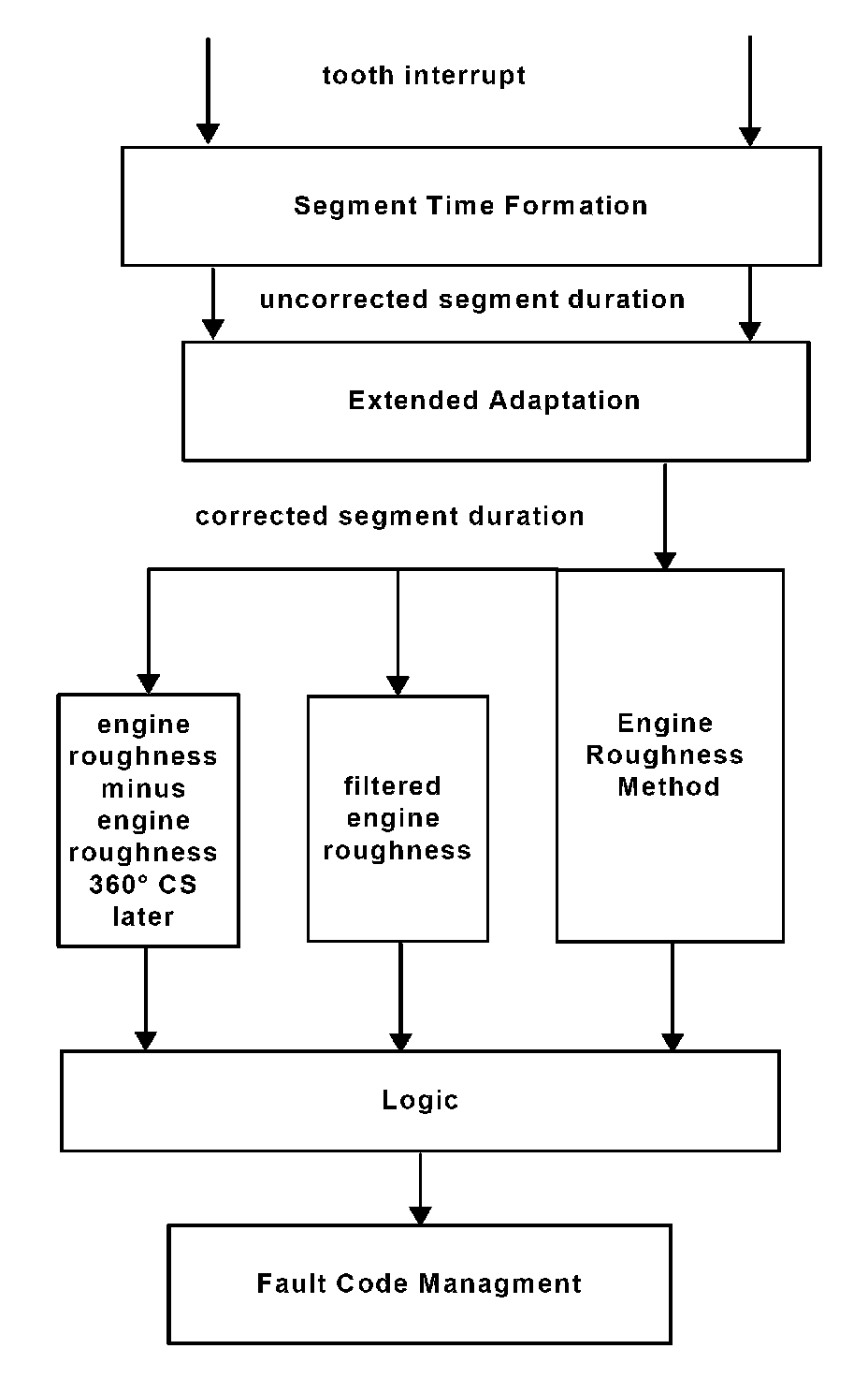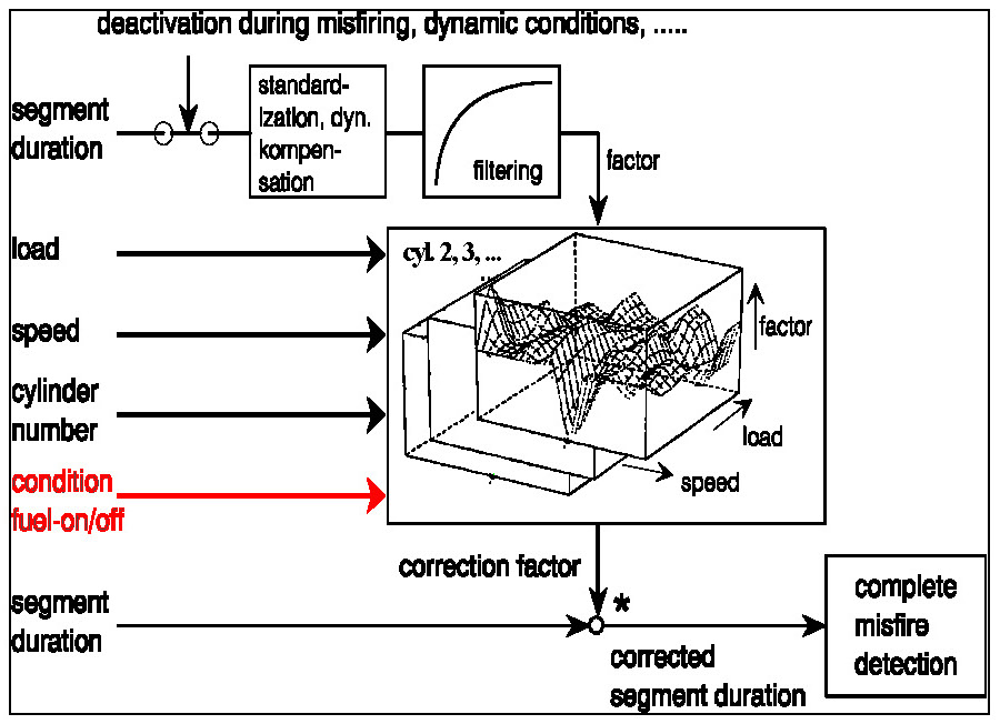 The adaptation during fuel cut off (fuel-off adaptation) and during firing operation (fuel-on adaptation) learns the systematic differences of the segment times dependant upon the individual cylinder's characteristics, see Diagnosis of Misfire Extended Adaptation. The correction values are included in the processing such that after adaptation the resulting segment times are identical (apart from the stochastic signal-to-noise ratio in steady-state).