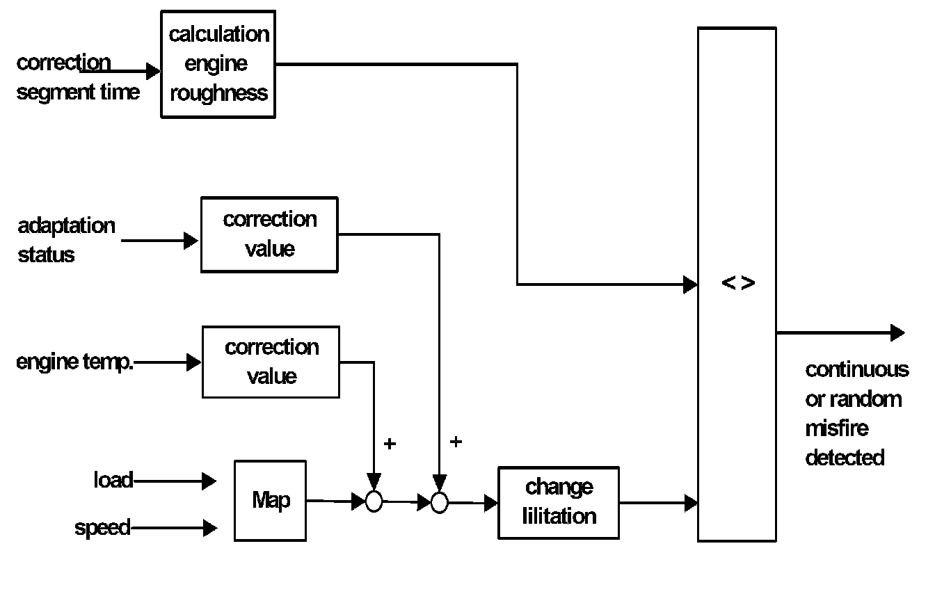 The detection performance is independent of sensor wheel inaccuracies (crankshaft-synchronous segment time fluctuations). However, symmetrical multiple misfires which can also generate crankshaft-synchronous segment time fluctuations cannot be detected. A calculated value is compared to a load and speed dependant threshold. If this threshold is exceeded misfire is detected.