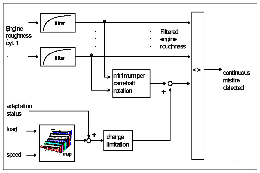 This function allows detection of continuous misfire in one or more cylinders, see Diagnosis of Misfire - Filtered Engine Roughness. For this the cylinder-specific engine roughness values are filtered by means of recursive low pass filters and compared to an accompanying threshold / reference value.