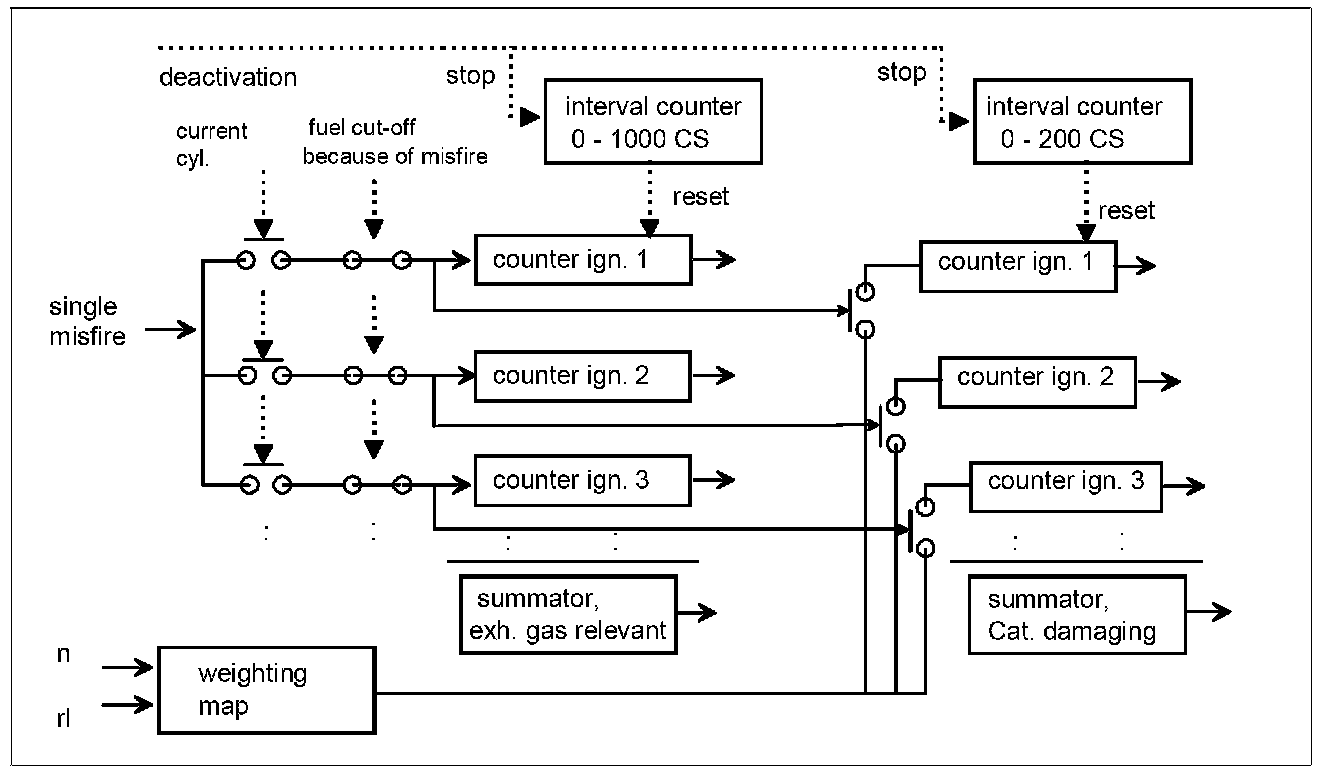 Each combustion, apart from those intentionally deactivated, must be checked for misfire since misfire can be distributed randomly, see Diagnosis of Misfire - Fault Code Management. However, a reaction will only take place if a certain misfire frequency is given. The different effects of the combustion misses, such as increase in exhaust emissions, and catalyst damage, are evaluated separately.