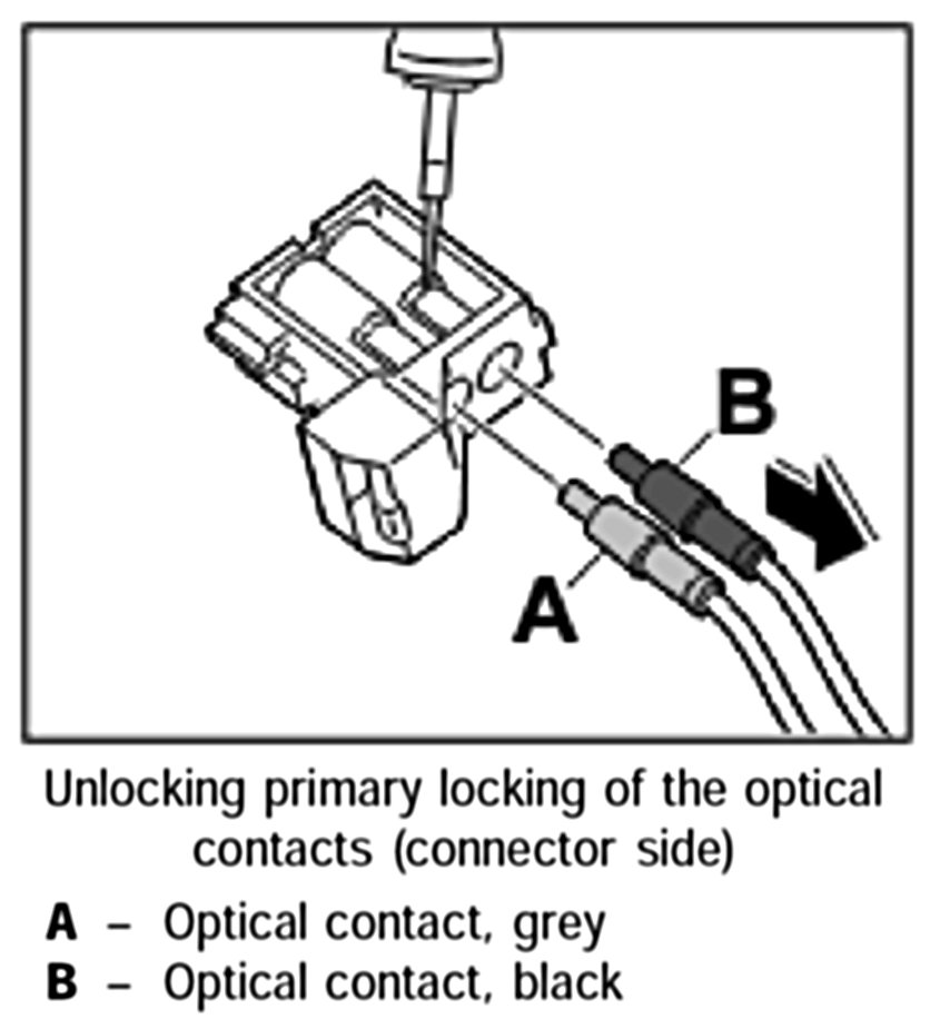 2. Release the connectors of the damaged optical waveguides on the affected components -Arrow a- and disconnect them. The illustration shows the connector on the CD changer as an example.