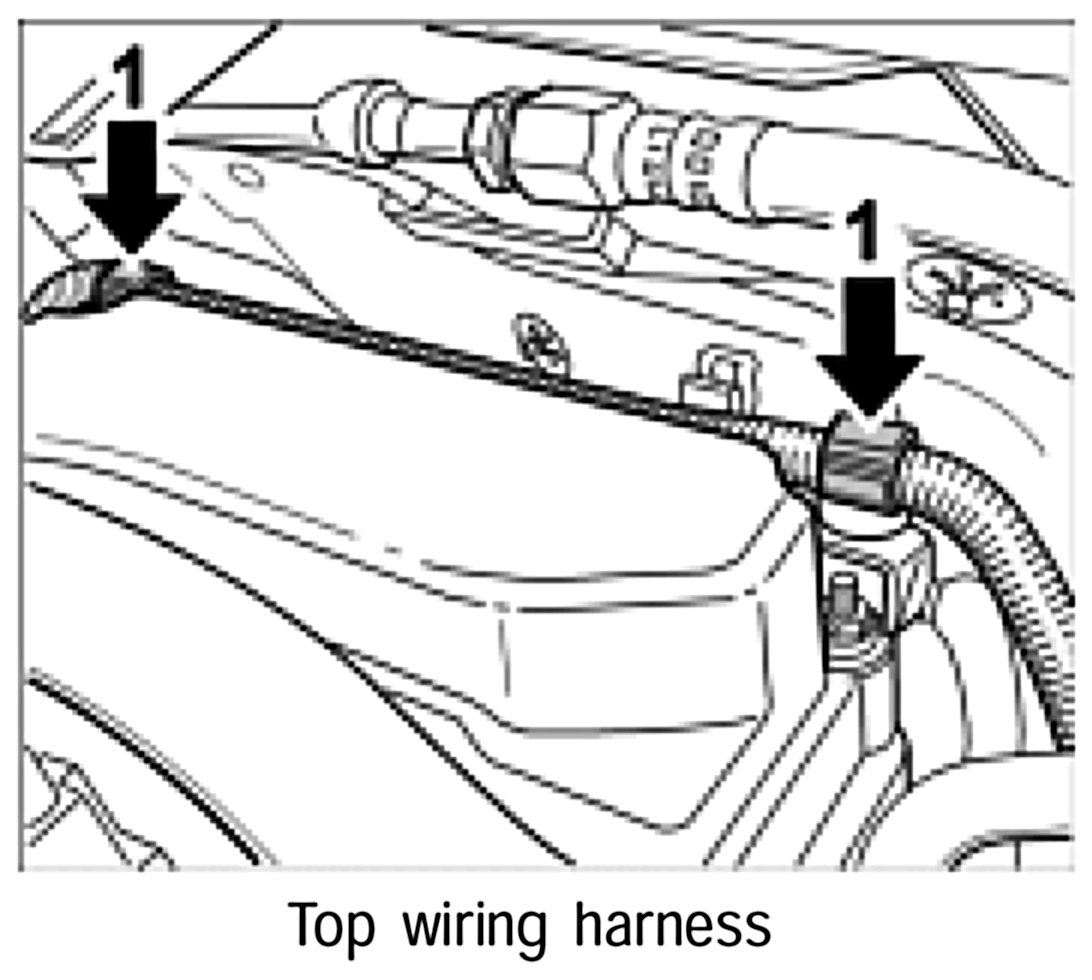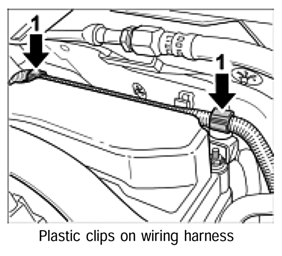 4. Insert top wiring harness into the two plastic clips -1- and close clips.
