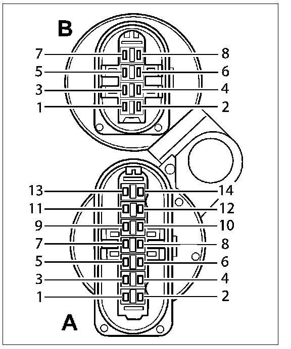 Socket for solenoids (transmission side) 'A', '14-pin' and sensors (transmission side) 'B', '8-pin'