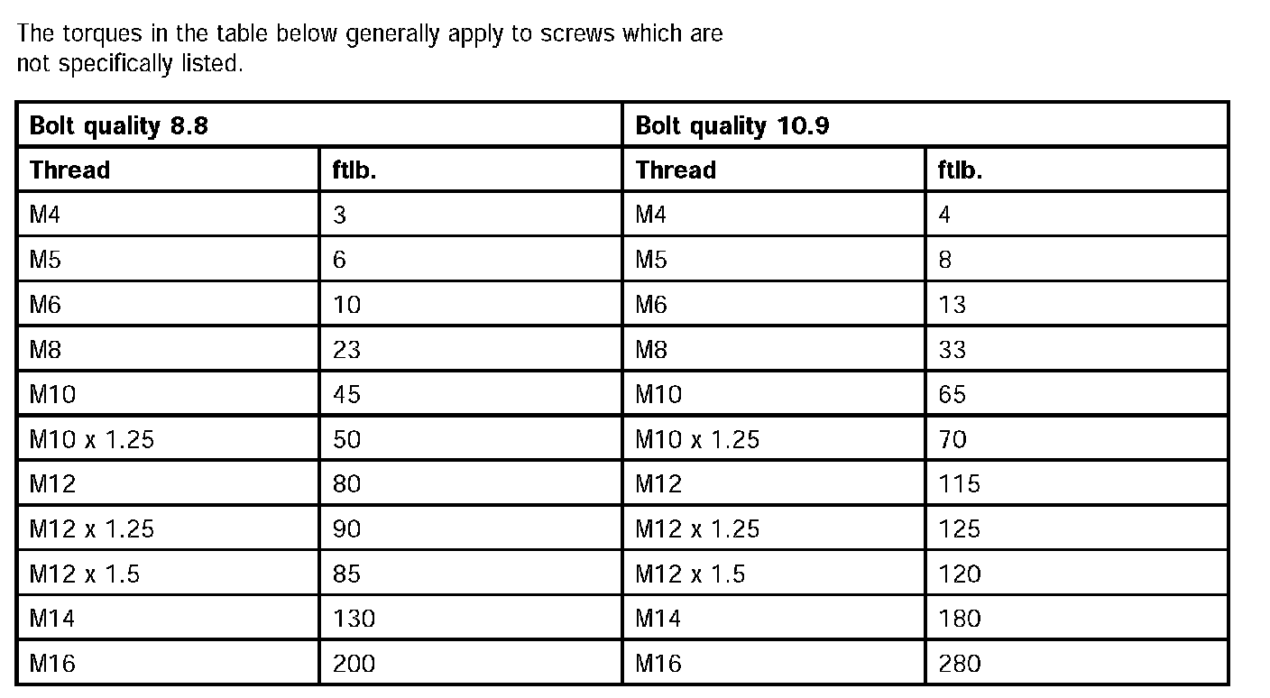 The torques in the table below generally apply to screws which are not specifically listed.