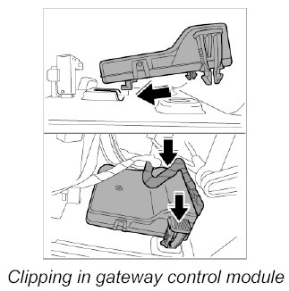2. Insert the gateway control module with the guide pin in the guide on the glove compartment and clip in.
