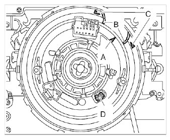 - Ensure that arrow -A- of the rotor is positioned between the markings -B- of the arrows -C- of the airbag contact unit and that the locking element -D- is engaged.
